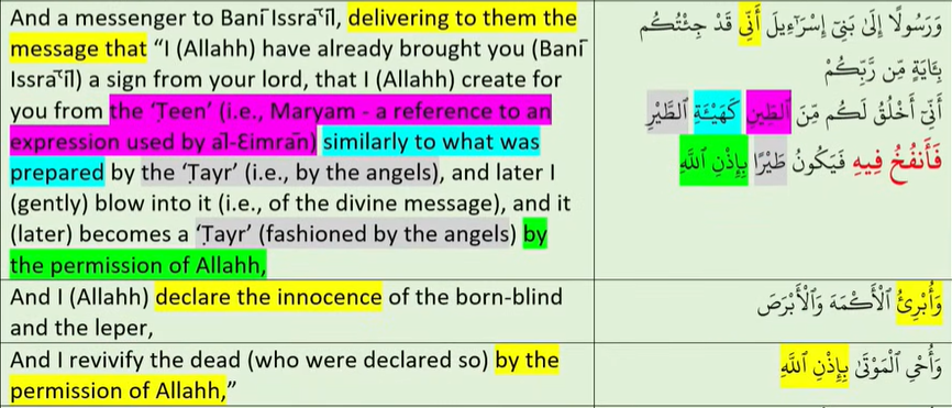 I've watched YT89 for several times and still struggling to understand the interpretation of ayat 3:49 & 5:110. I apologize but let me say that it doesn't make sense to me that Allah is saying "I (Allahh) have brought you a sign from 'your lord' and that I (Allahh) create…., blow….., declare innocence….., and revive the dead “with Allahh’s permission” (باذن اللہ) in ayat 3:49.